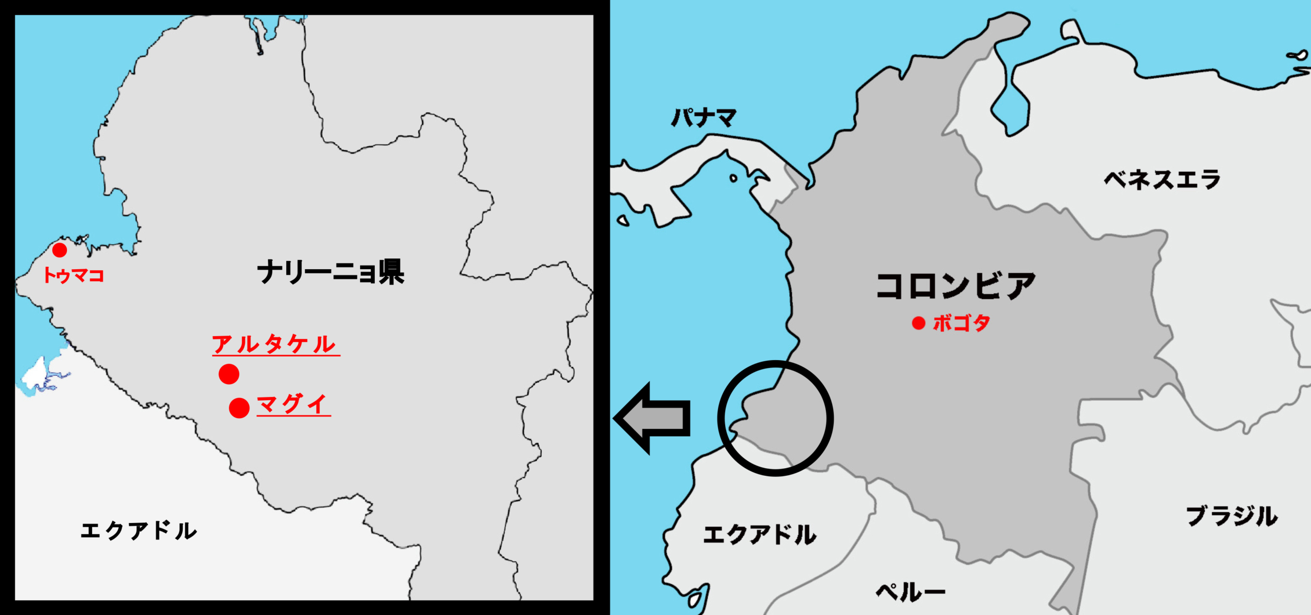 2013年4月、私はコロンビア南西部、標高約1000メートルにあるアルタケルという町にいた。500人余りが暮らす小さな町だ。ここにはカトリック教会の他、20から30軒ほどの商店、学校、診療所が集まる。週末には多くの人が収穫物の売り買いに訪れる、地域の中心的な場所だ。周囲の山々には、先住民族アワの自治地域が広がっている。