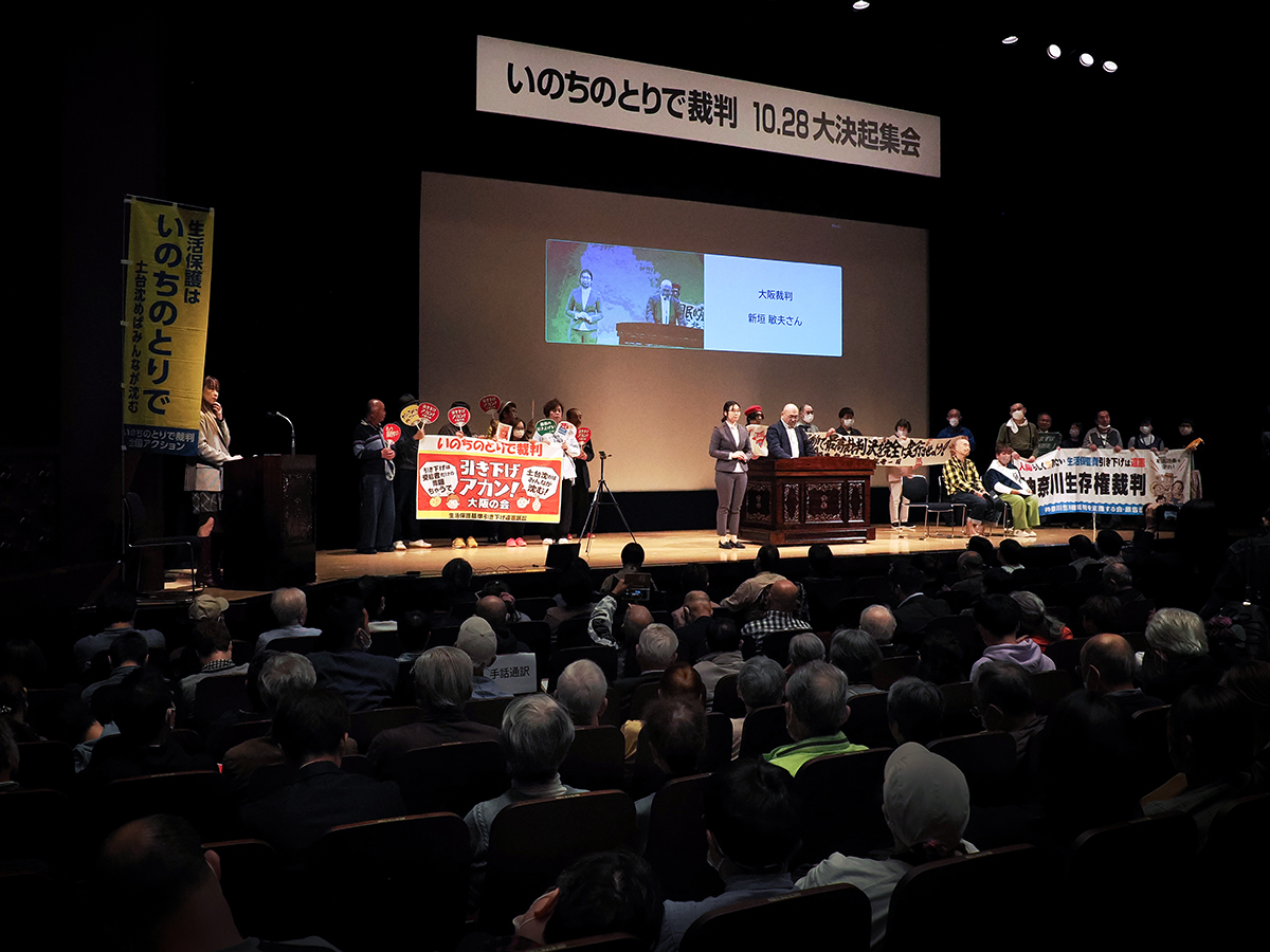 その大幅引き下げを違法とした最高裁判決から4ヵ月が経った10月28日、原告や支援者らによる「いのちのとりで裁判 10.28大決起集会」が都内で開催され、会場・オンラインあわせて1400人が集った。