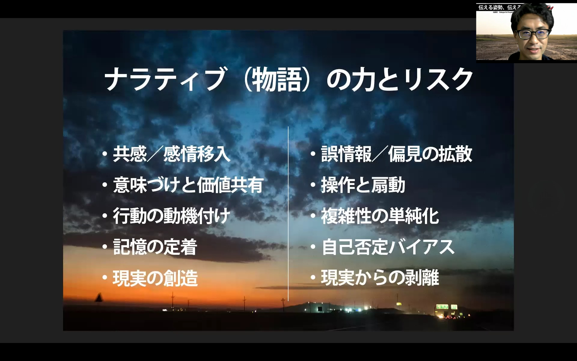 また受け手は一度立ち止まって「なぜこのナラティブを信じるのか、このナラティブの前提は何か」を考える必要があることを佐藤は伝えました。