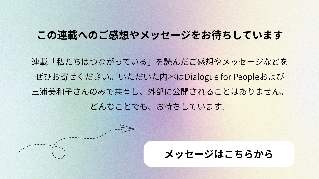 秋田市在住でフリーの記者としてジェンダーやセクシュアリティ、人権について発信している三浦美和子さんの新連載『私たちはつながっている』。第1回をお届けします。