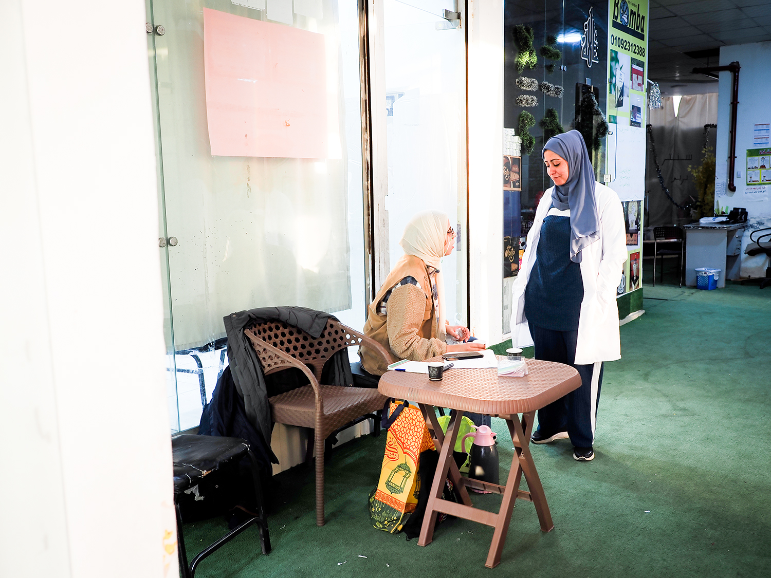 医療的なケアが必要な人々を待つフィダーさん(右)とアマルさん。(安田菜津紀撮影)