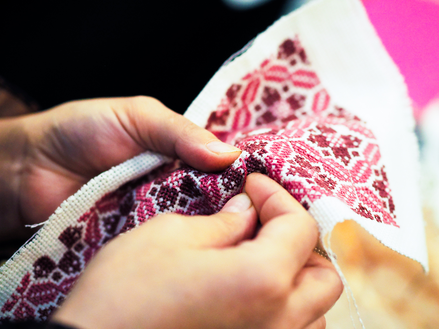 「希望の糸」に参加する女性が、丁寧に刺繍を仕上げていく。(安田菜津紀撮影)