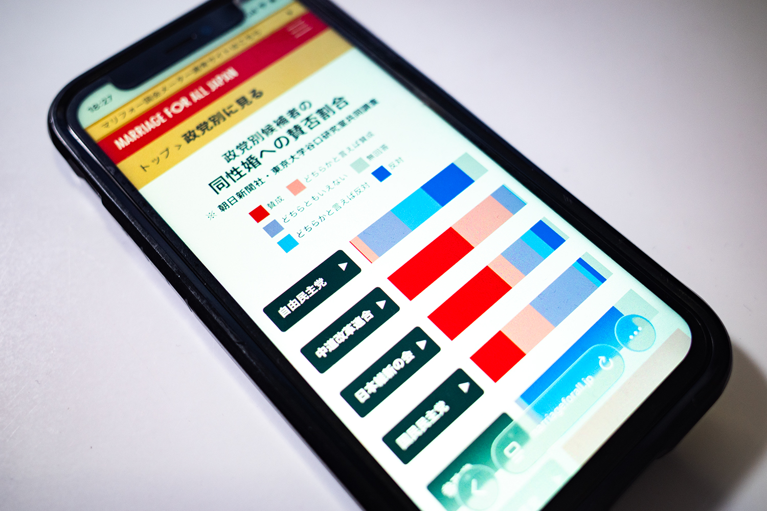 政党別候補者の同性婚への賛否割合などが、視覚的にもわかりやすい「マリフォーメーター」。(佐藤慧撮影)