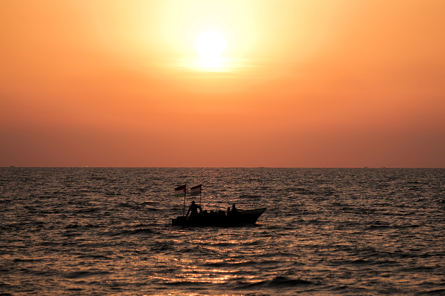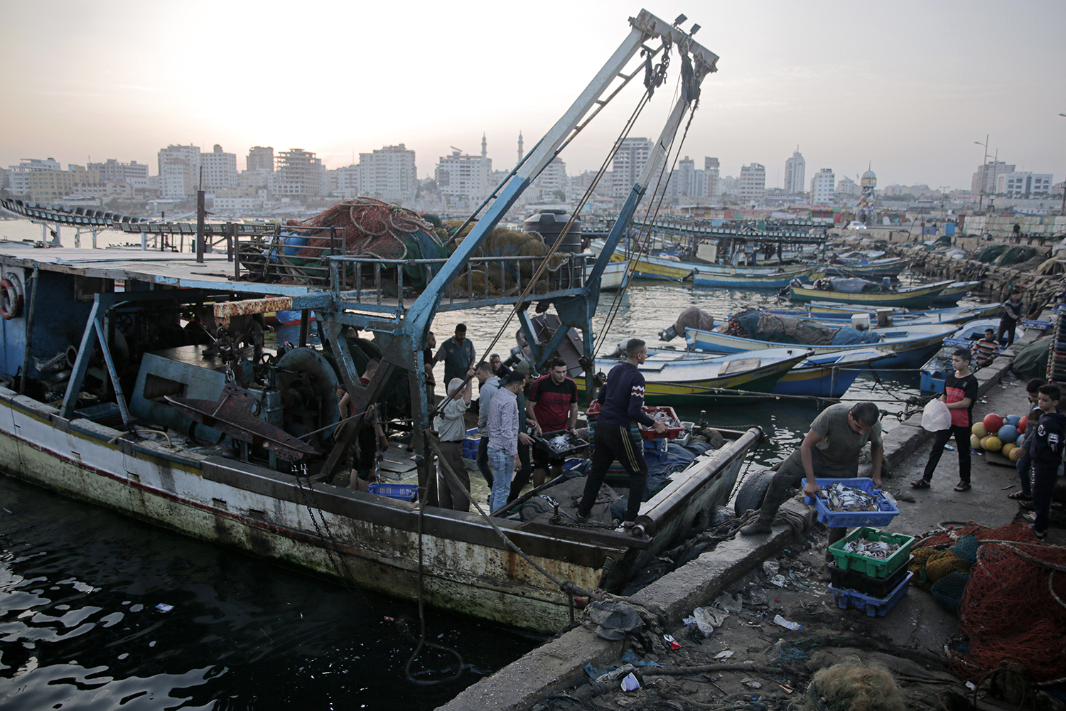 早朝、かすかな光の中、街がまだ完全には目覚めていない頃、漁師たちが一晩の漁を終えてガザの港に戻ってきます。写真に写る舟は、男たちの疲労だけでなく、彼らの収穫物も運んでいます。制限された水域(※)で獲られた魚を入れた箱には、希望も詰まっているのです。