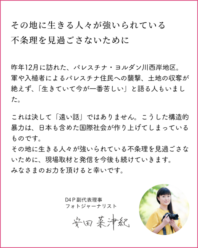 長年イスラエルによる占領状態に置かれ、凄惨な攻撃が行われてきたパレスチナなど、現地を取材し、命が奪われる現状を止めるための糸口を探し続けます。
