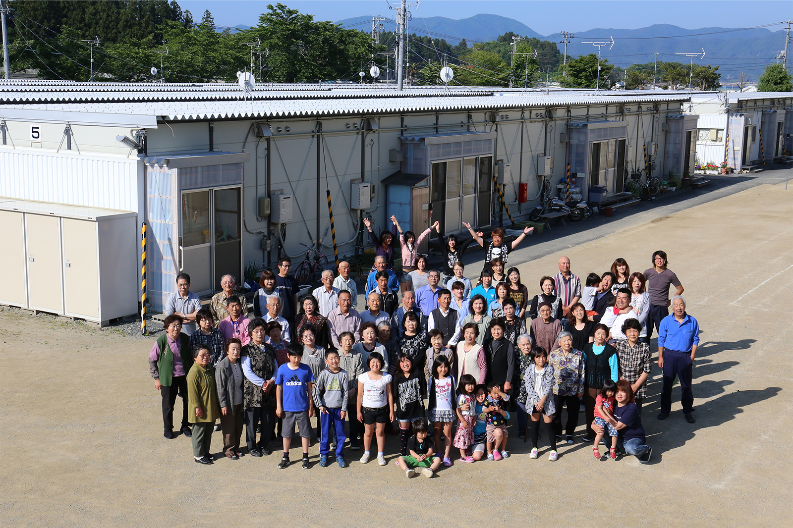 米崎小学校仮設住宅のみなさんの集合写真。夏は暑く、冬は寒い仮設住宅は、壁の薄さ、狭さもあいまって、心身ともにストレスの溜まるものだったと言います。2017年に解体が始まるまで、数えきれないほど訪問させて頂きました。(安田菜津紀)