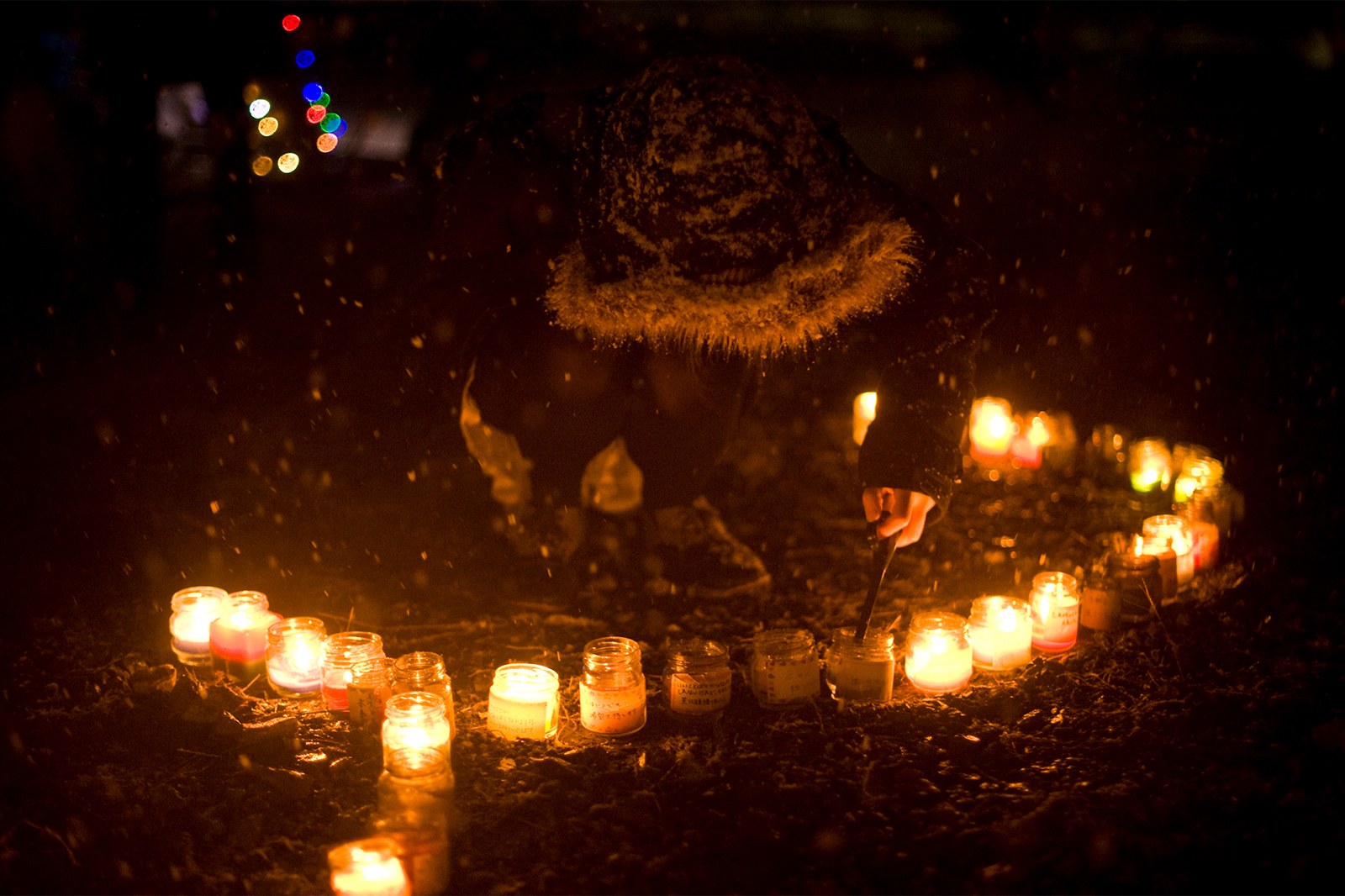 亡くなった人々を悼むろうそくの灯りが、雪の降る3月に揺らめいていました。冷たい風に吹き消されるろうそくを、一本一本、丁寧にまた灯していきます。一見非論理的に思える「悼む」という行為が、「復興」というものに欠かせないものであると、こうした時間を過ごすたびに思います。(佐藤慧)
