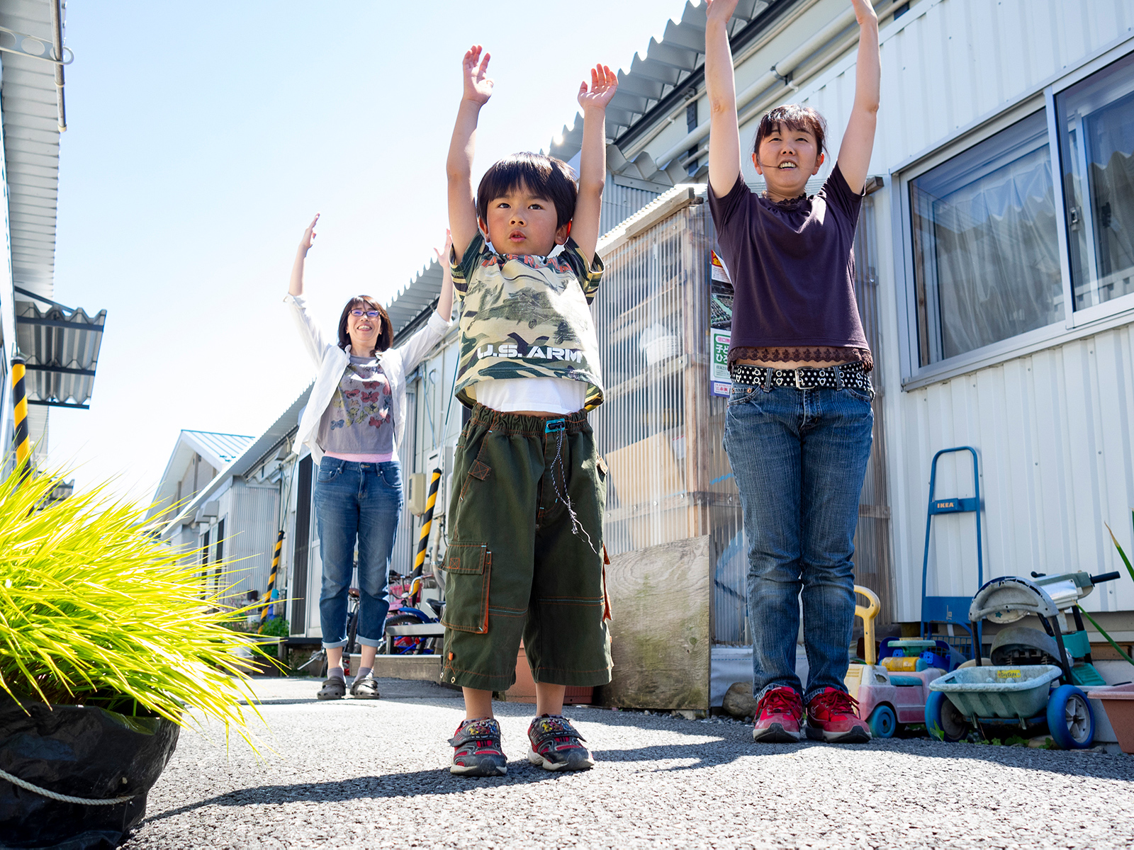 米崎小学校仮設住宅に暮らす佐藤さん一家の写真を、その3人の子どもたちの成長の様子を含め、季節ごとに撮らせて頂いてきました。出会った頃はまだ言葉も喋れなかった悠也くんも、保育園、小学校と経て、そして今(2022年)では中学生になりました。写真は仮設住宅の通路でラジオ体操をする悠也くん。(安田菜津紀)