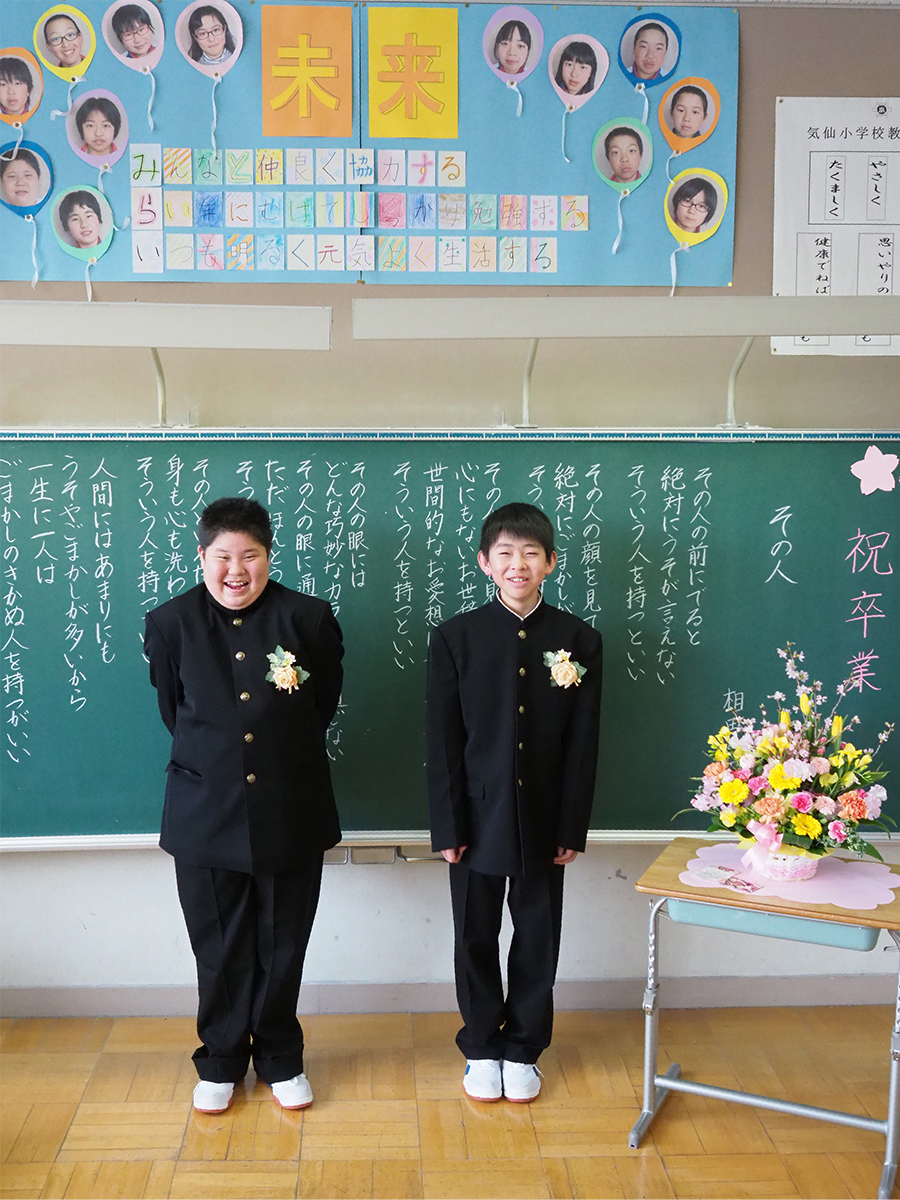 2011年4月21日、私は被災した街の写真館に代わり、小学校の入学式で記念写真を残すお手伝いをすることになりました。担当させてもらった気仙小学校の元の校舎は最上階まで波につかり、体育館はガソリンが引火したために黒く焼けただれています。入学する二人の男の子たちが晴れの日を迎えたのは、この学校の図書室でした。そして2017年3月17日、あの日入学した鈴木文也くん(左)と志田蒼生(あおい)くんは無事、卒業の日を迎えていました。「カメラマン、緊張してるのー?」と無邪気に声をかけてくれた6年前。あの頃よりも少し大人びたはにかむ笑顔に、夢中でシャッターを切ります。この街の宝物が、これからも輝けるよう、そっと願いを込めながら。(安田菜津紀)